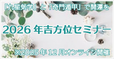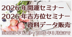 2025/12/20 『『2026年開運セミナー』『2026年吉方位セミナー』資料データ販売』の受付を開始致しました。なお、資料販売は「2026年3月31日(火)まで」の「期間限定」となりますので、期限内にご購入下さいます様、お願い致します(お申込みはこちら)。